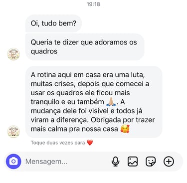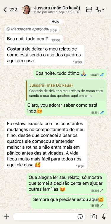 Eu sou a Letícia, mãe do Victor hoje com 11 anos. Quando meu filho foi diagnosticado com autismo, eu me vi diante de uma rotina caótica e imprevisível. As crises e as dificuldades em entender o que viria a seguir eram constantes, e eu sentia que estava perdendo o controle. Como mãe, o maior desejo era ver meu filho mais calmo, seguro e capaz de entender o que esperar do seu dia. E foi com a ajuda das terapeutas dele que criamos quadros de rotina para ele, uma ferramenta simples, mas poderosa, que trouxe clareza e estrutura à vida dele — e à minha também. Ao perceber o quanto os quadros de rotina realmente ajudaram ele a diminuir a ansiedade e ter menos crises e mais autonomia, entendi que isso não era apenas uma solução para nossa casa, mas algo que poderia ajudar outras famílias a viverem de forma mais tranquila e organizada. Eu criei esse quadro com muito carinho, pensando em como poderia transformar a vida de outras mães, com quadros realmente pensados para nossas crianças, proporcionando-lhes a paz e a previsibilidade que eu tanto precisava.